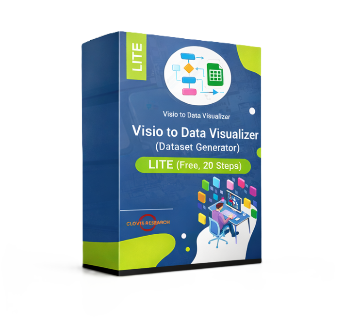 Product box for Visio to Data Visualizer Dataset Generator LITE, free edition limited to 20 process steps.Visio to Data Visualizer (Dataset Generator) – LITE (Free, 20 Steps)